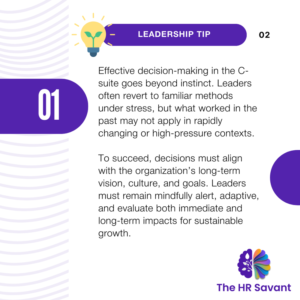 Effective decision-making isn't just about acting quickly in the moment—it is about ensuring your decisions align with your organization's long-term vision, culture, and goals. To succeed, leaders need to stay mindfully alert, adaptable, and evaluate both immediate and long-term impacts to drive sustainable growth. 🧭